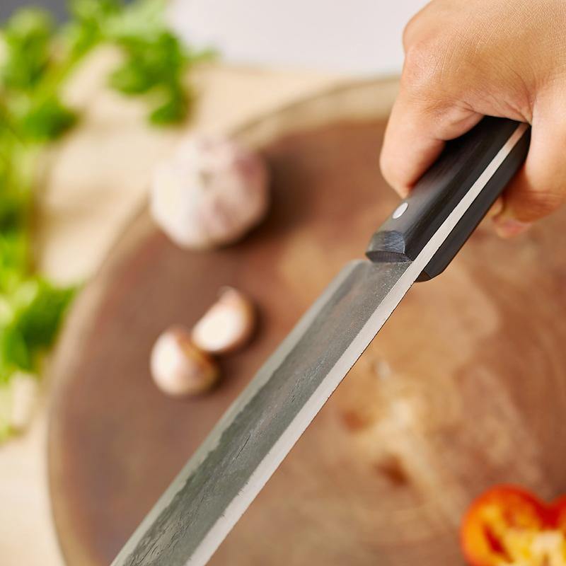 A alça bonita é feita de madeira compensada e equilibra a lâmina resistente perfeitamente. É muito confortável para sua mão e garante um processo de corte eficiente sem ferir suas mãos.